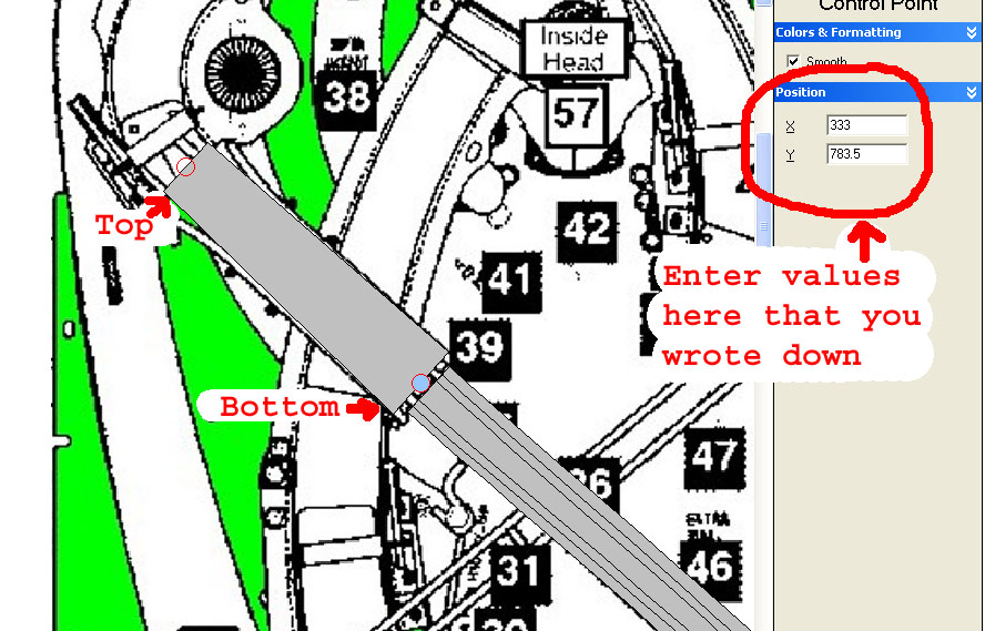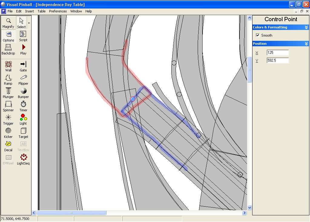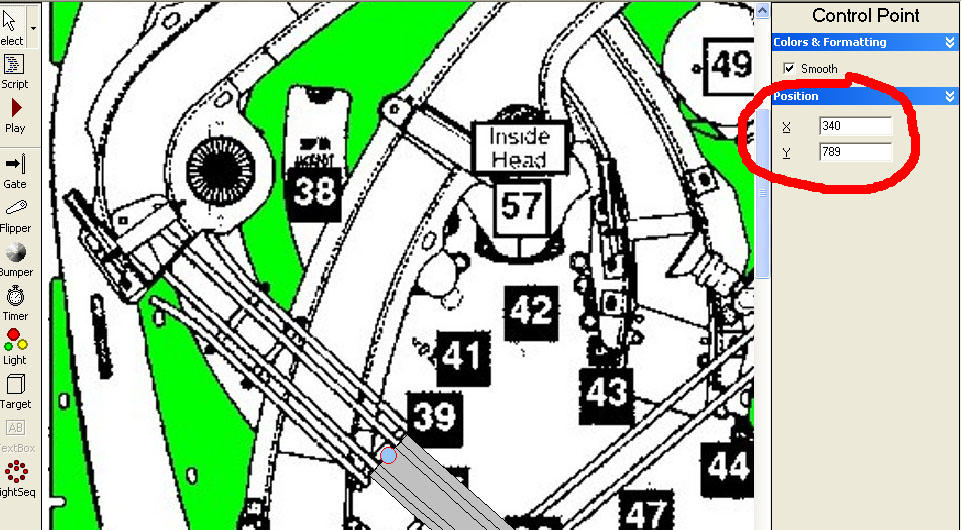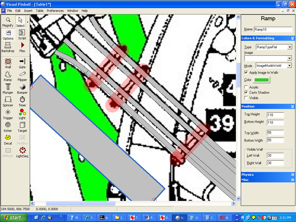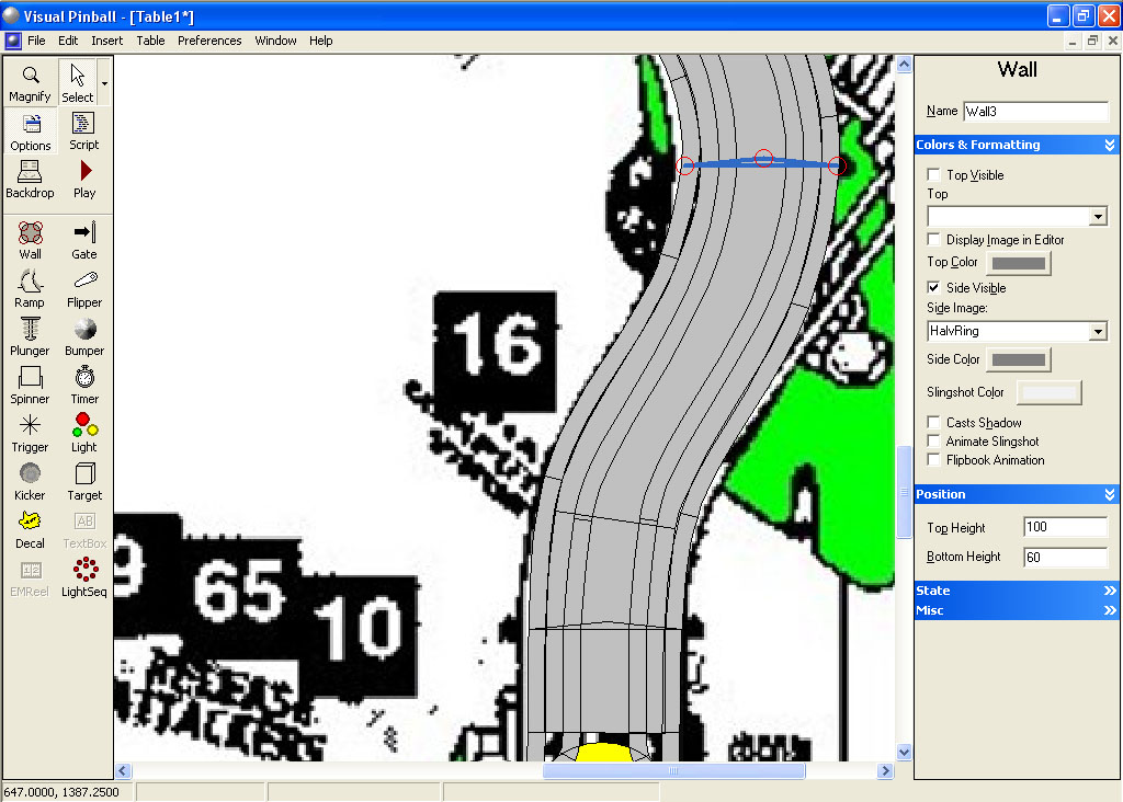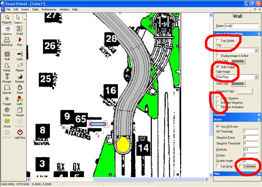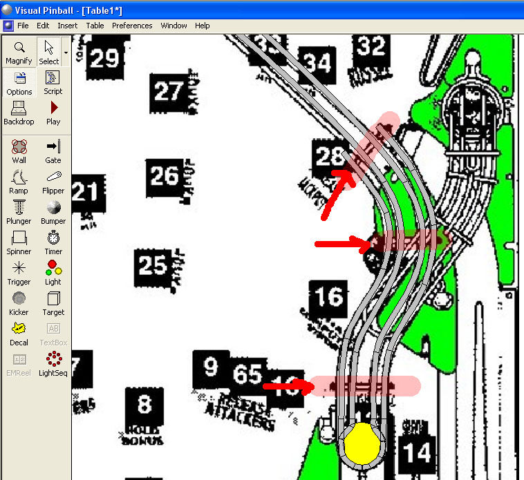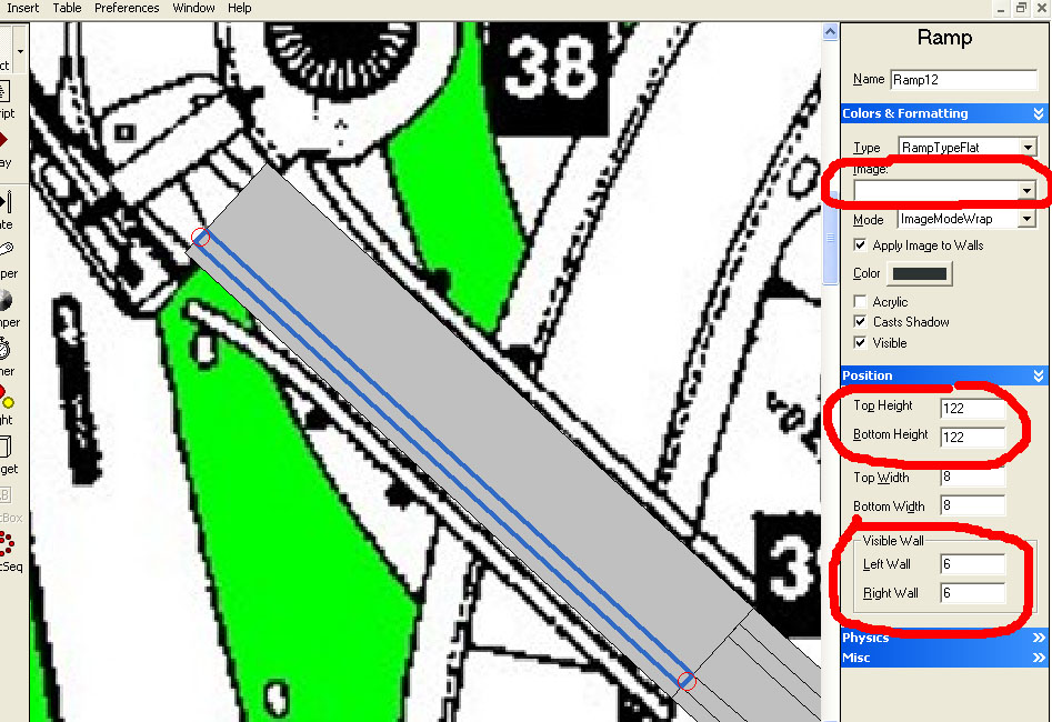 Add a target to the table near where the lower half ring goes. Un-check Top Visible, change the Side Image to HalvRing. Un-check Cast Shadows, Animate Slingshot, and Collidable. Set the bottom height to 60 and the top height to 100 (we use 60 for the value since our invisible floor ramp height at this point is 60. We use 100 for the top to make it 40 units high).