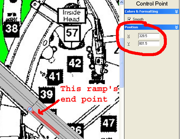 Write down the X and Y values then select the transparent ramp then click on its end control point and make it match the same X and Y values that you wrote down. You will then need to adjust the next control point up so that the end of the transparent ramp matches the same angle ad the end of the wire invisible floor ramp: