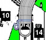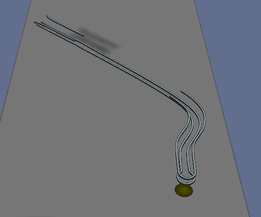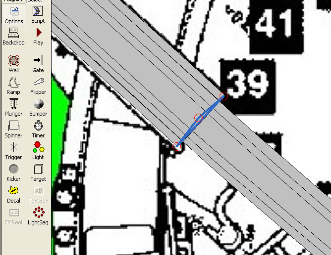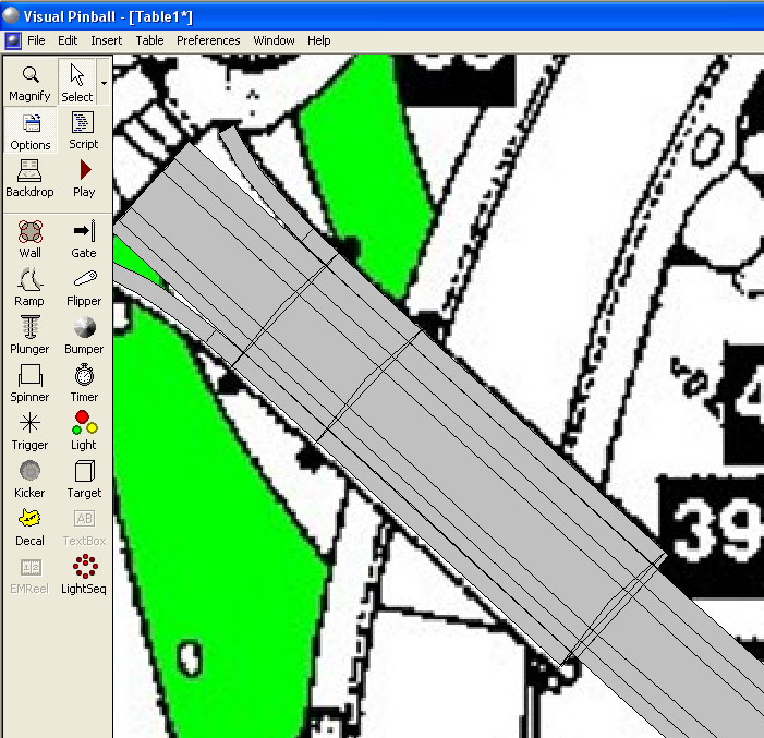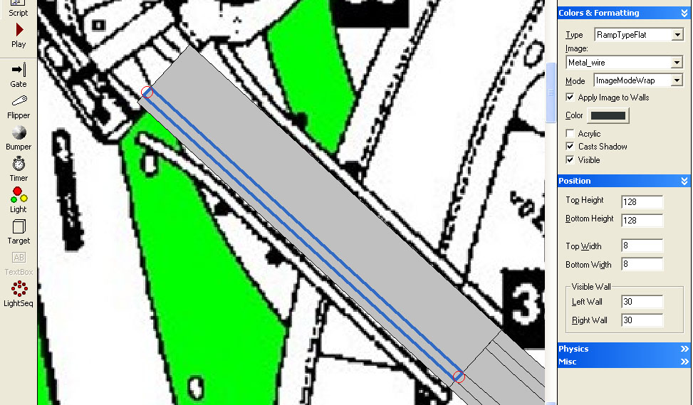 Let’s add a bit more realism to the bottom where the ramp is attached to the right slingshot. Using what you learned above, add a ramp with top and bottom height of 60 that has the metal wire image and another ramp of top and bottom height 54 with no image but color black. Make it in the following shape:
