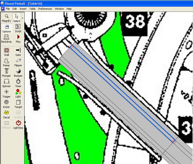 Now we need to add an invisible wall with bottom height of 60 and top height of 110 and elasticity of 0. This wall is needed at the lower end of our ramp to stop the ball and let it drop back to the playfield. It doesn’t have to look pretty since you will be turning the top and side visibility off. Just make sure that it is stays outside of the round opening at the end: