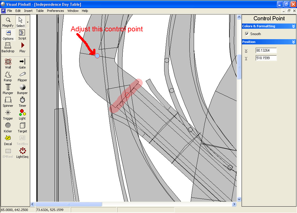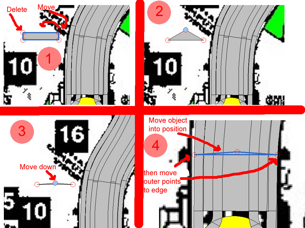 Now delete the upper left control point of our target object. Move the upper right point over to the center, then move it down close to the line between the left and right control points. Now move the whole object into position and move the left and right control points out to the edge of our invisible flat floor ramp. You will need to zoom in a couple times so that it’s easy to grab the object to move it.
