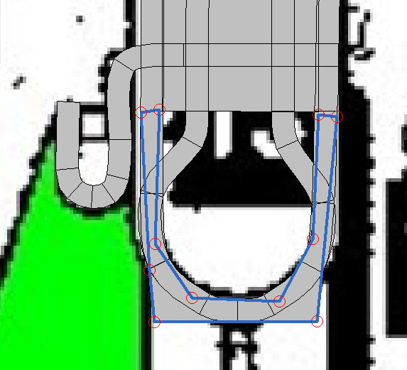 The upper end of our wire ramp and the end of the transparent ramp need to meet. They probably look like the following image. Click on the invisible floor ramp of our wire ramp and then click on the very end control point: