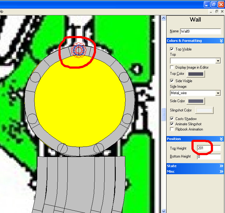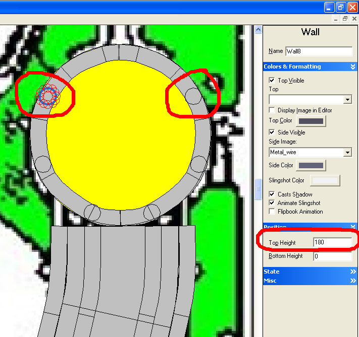 Now make sure the bottom height is 0 and the top height is 125 (125 being the same height as our lower narrow wire ramps with image Metal_wire). Set the side image to Metal_wire and uncheck collidable. Now put two copies straight above where the inner two narrow wire ramps end but placed on the round ring object: