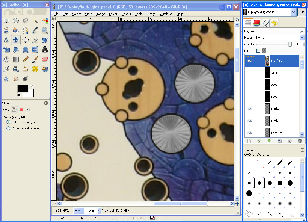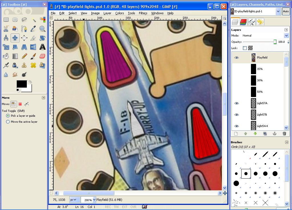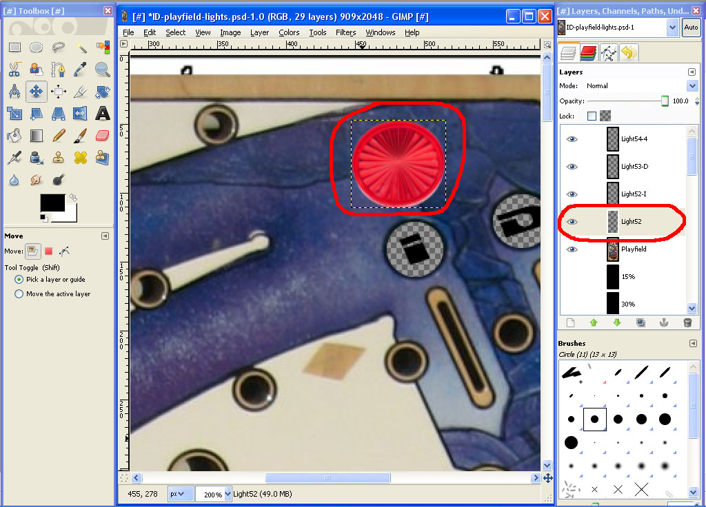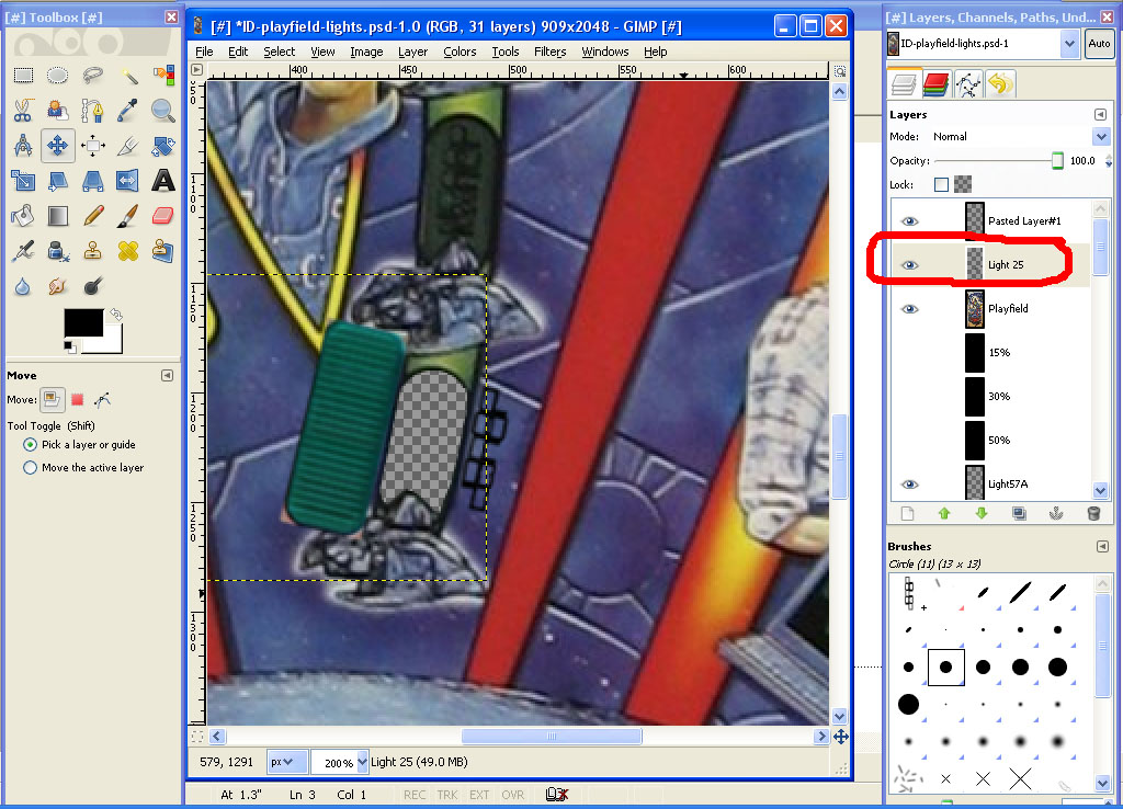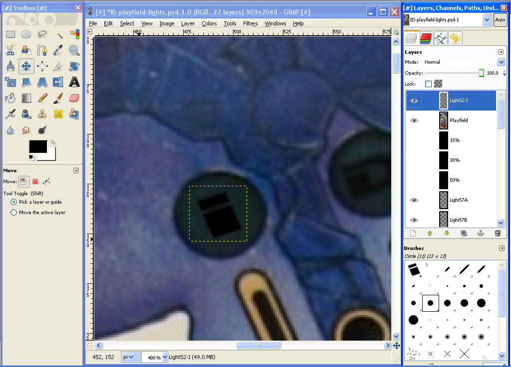 Start up The Gimp and load your playfield file in. Load in the LOCK1.svg file. Zoom in a bit on your LOCK1 image and make a rectangle selection around the text. Copy and paste it into our playfield image. Move it close to where it goes and zoom in: