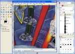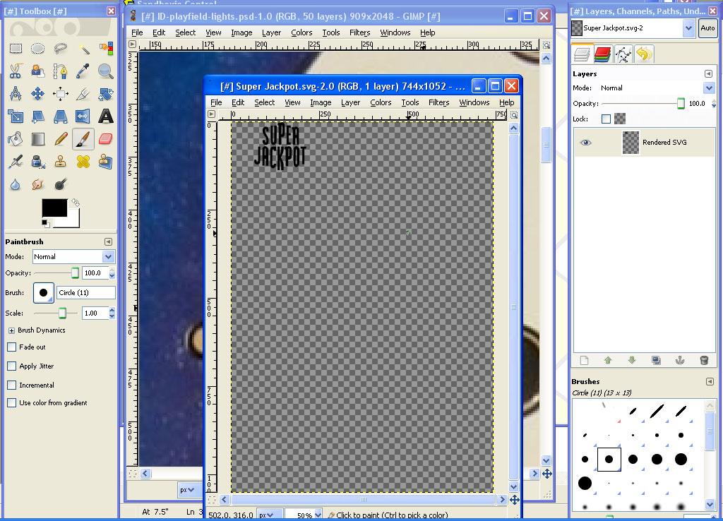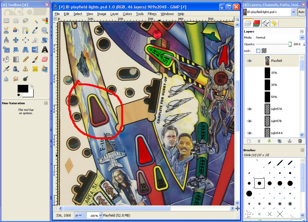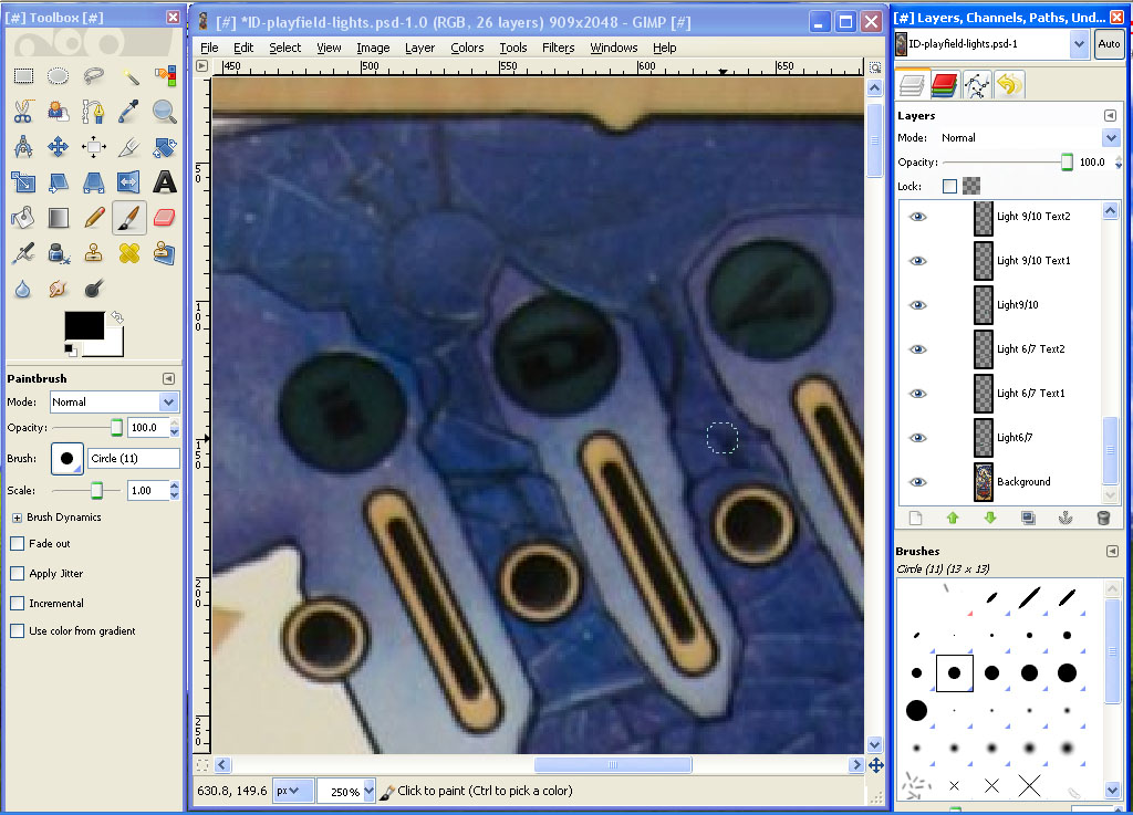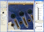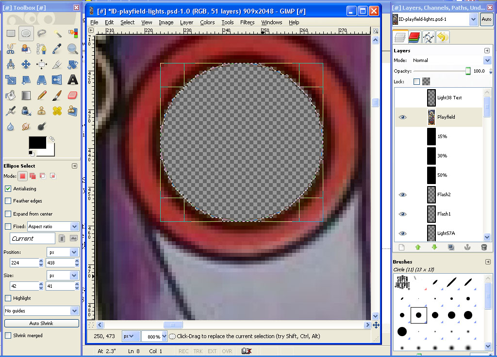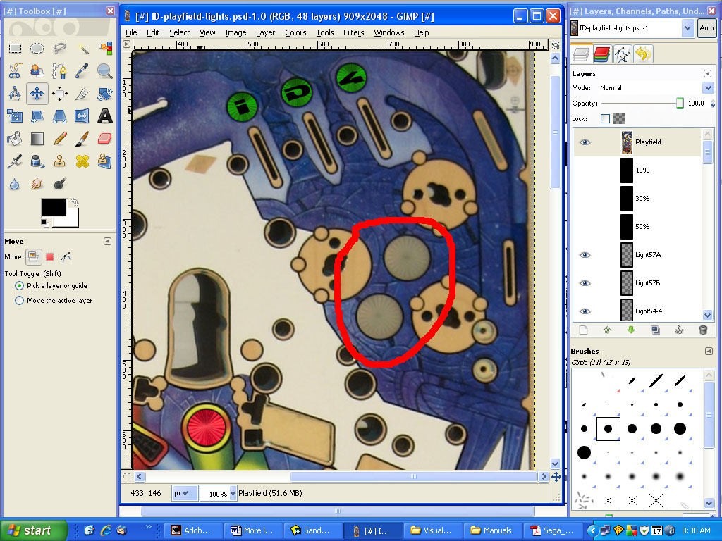 Start up The Gimp and load your playfield file in. Load in the LOCK1.svg file. Zoom in a bit on your LOCK1 image and make a rectangle selection around the text. Copy and paste it into our playfield image. Move it close to where it goes and zoom in: