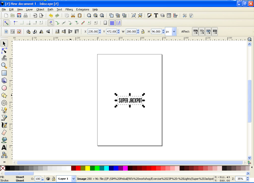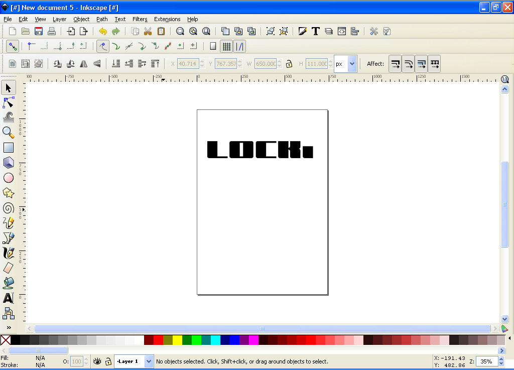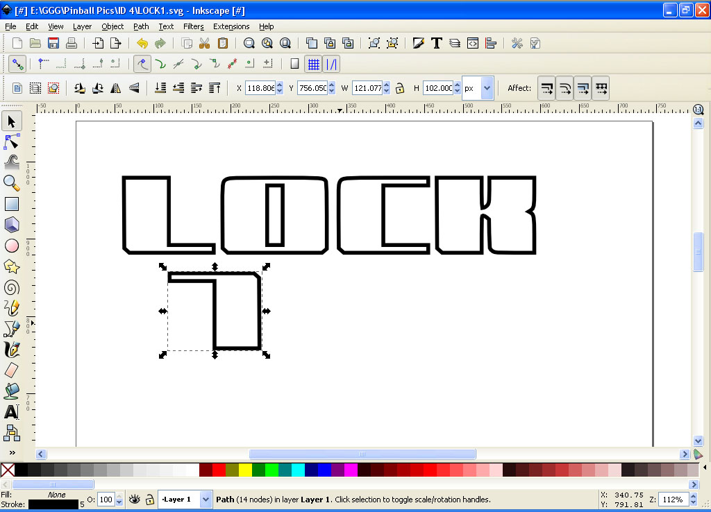 Well, after some experimenting importing our LOCK1, 2, and 3 images into The Gimp and scaling them down, I found out that the black outlines end up turning gray by the time we scale down to the right size for our playfield. To correct this, go back into Inkscape and for each of the three files, load them back in, hit CTRL-A to select everything, and scale down to around 16% (you will see your scale % at the bottom of the screen just to the right of the layers area). Make sure you hold down the CTRL key to scale proportional. Now set the line stroke width to 2 and re-save the file.