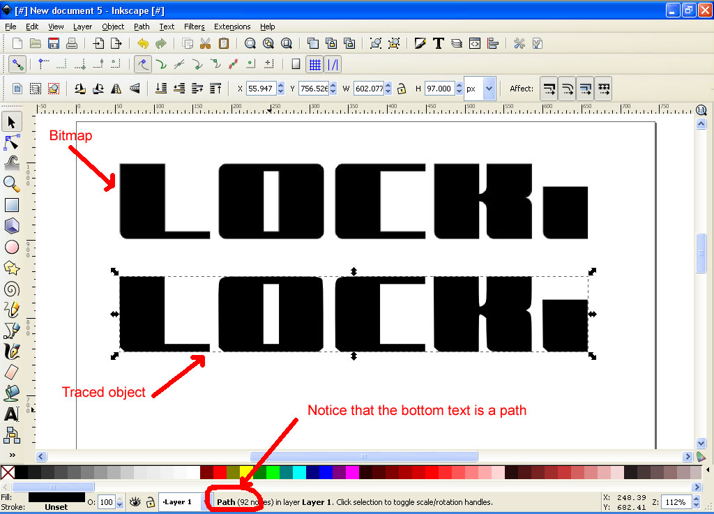 Hit the OK in the dialog box and then close it. You won’t see much difference on your screen, but if you move the currently select object down you will now see two lines of text. The top one is our original bitmap and the bottom one is a traced version of it: