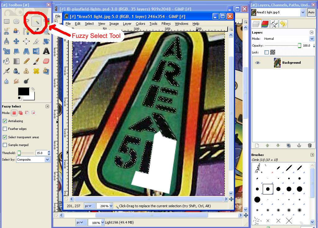 Now cut out the inside of the light insert first using the ellipse selection tool for the top curve, then the free select tool for the rest: