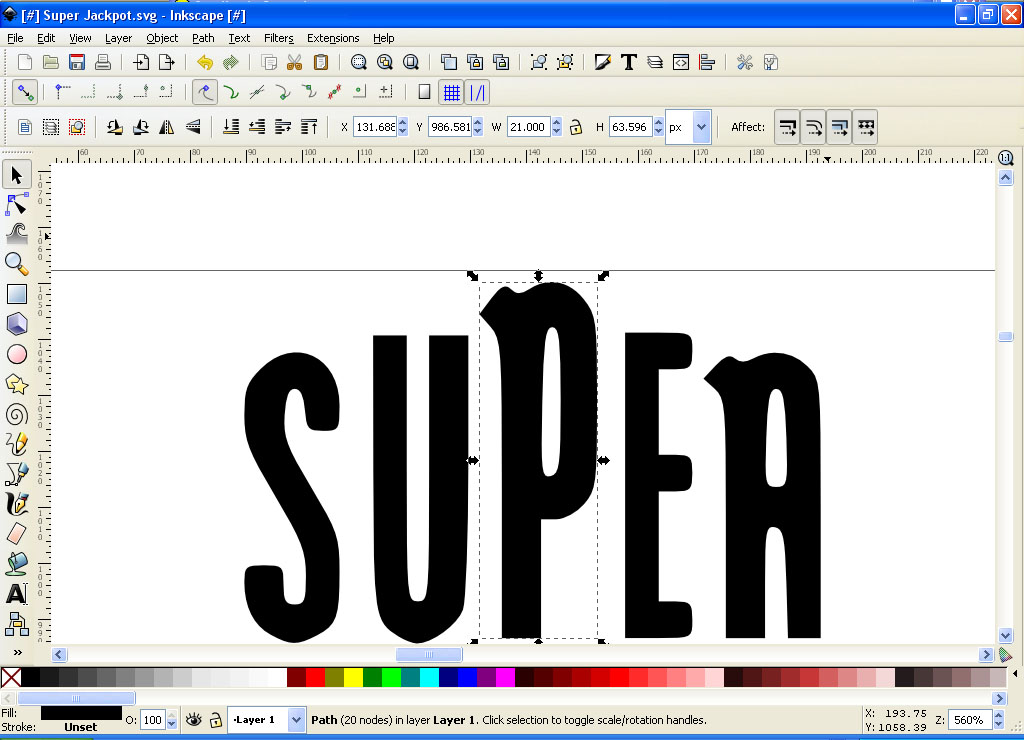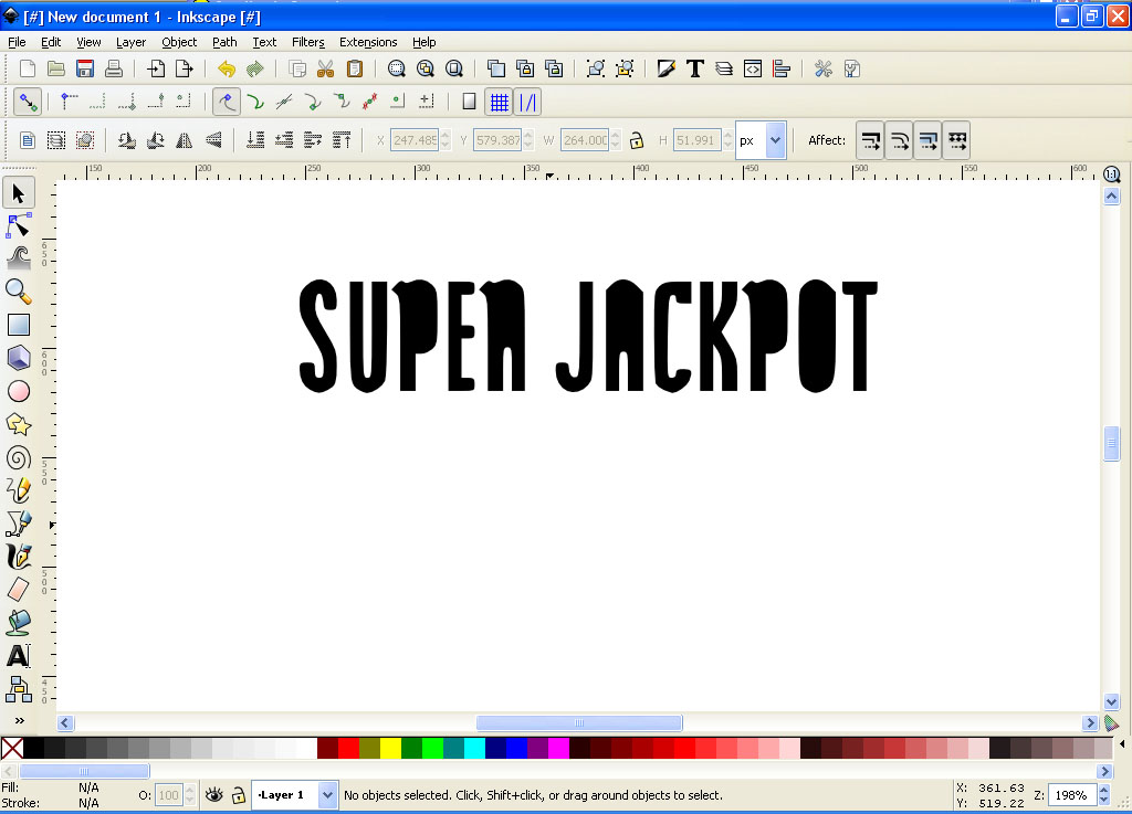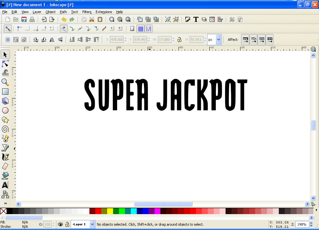 Now align the letters vertically. Note that the letter “O” consists of two objects. The outer one and the ininer one. You can group them together so they move as one by making a rectangle selection around them and then go to the Object Menu and select Group. Now they will move as one object. When you are done it should look something like this: