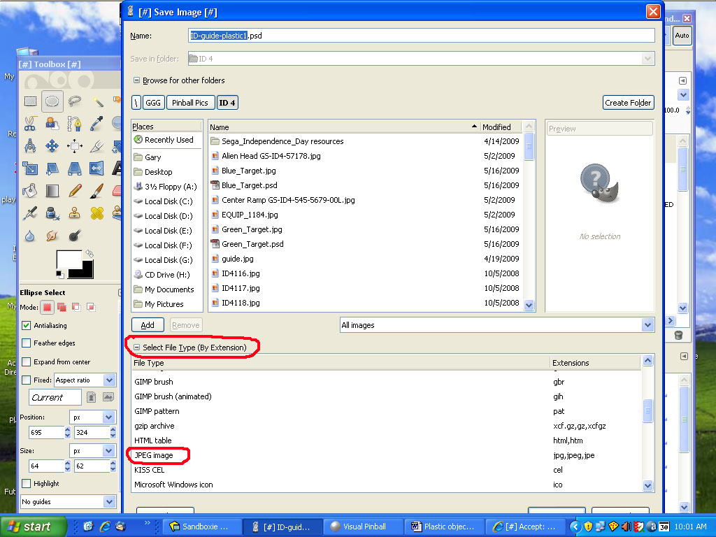 The first thing we need to do is take our plastic image with all the different layers for each plastic piece and save it as a .jpg image. To do this from within The Gimp you go to the File menu, Save As. In the dialog box that comes up click on the little square in front of Select File Type and then select JPEG: