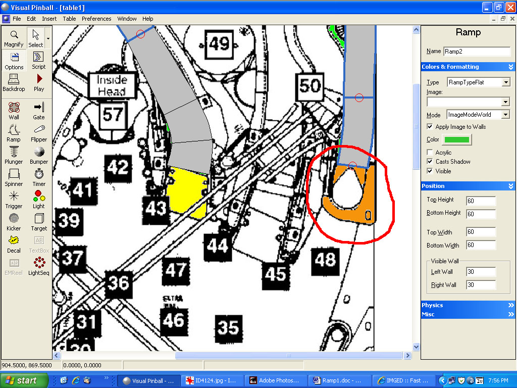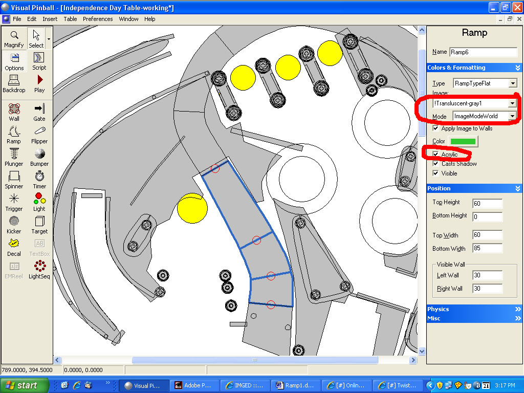 I must use a master table and make stuff with that one and copy and paste it into my wip since, there being so many different objects my poor comp must render, it goes so slow with the table redraw each time I do anything to it. so I have two tables open, one with everything one with just walls and targets. I'm into making the rubbers for the table, then plastics, then I should be all caught up oh...now and ramps! woohoo translucent ramps!!! FINALLY