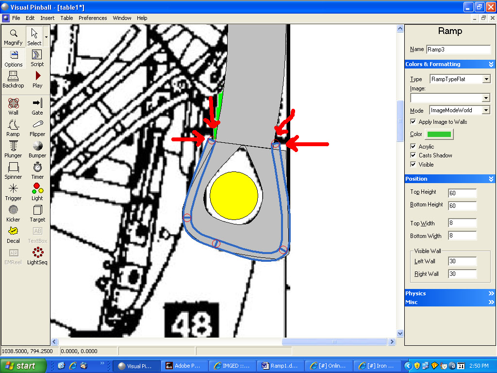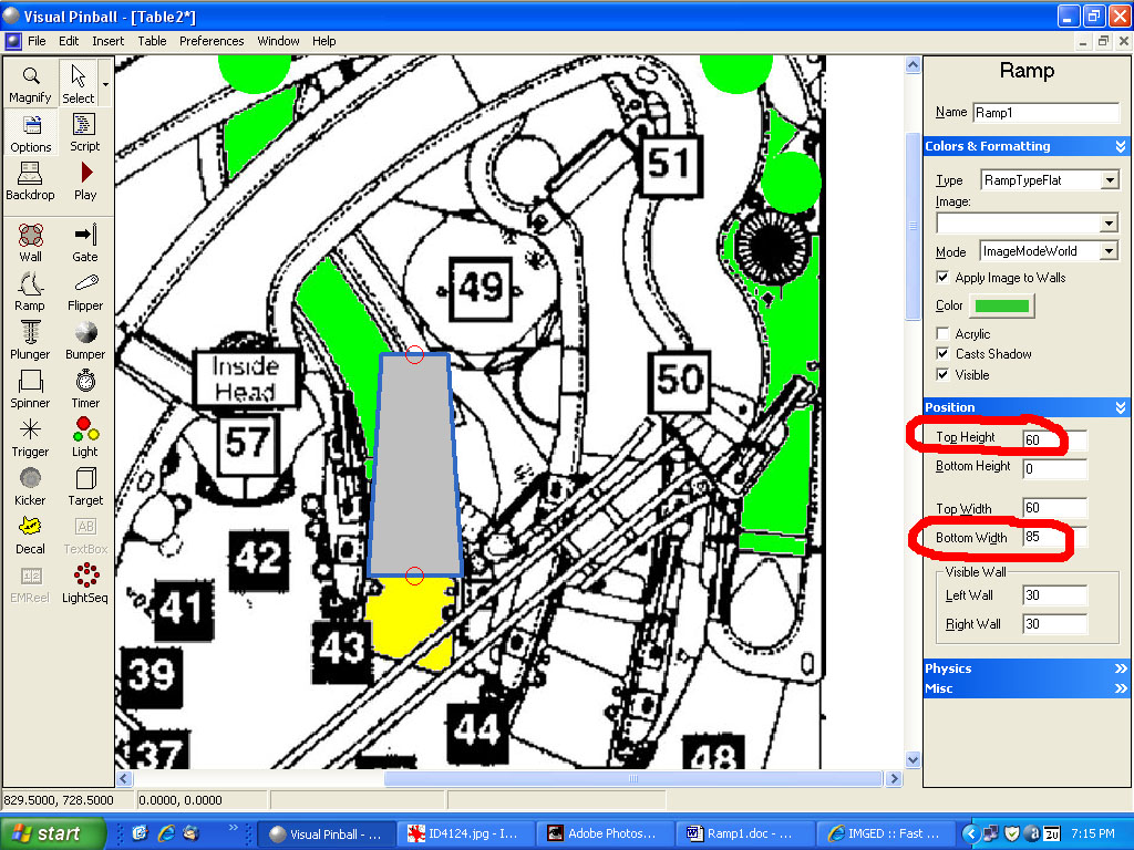 Start up VP and load in your working ID table. Create a new table and switch over to it. Delete the outer wall object. Under Physics, change the table height to 2300 (the width should already be set to 1000) to match the dimensions of our working table. Import the Ramp1-guide image into your table and set the table image to it (make sure Display in editor is checked and turn off Show Grid):