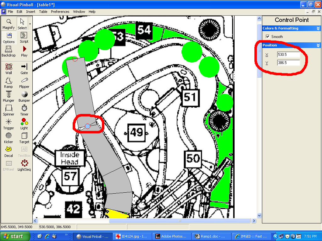 I've managed to layout the second and third ramp, I even made the holes for the ball to drop through and put in the gates where they appeared to be on the blueprint. I even managed to make the second and third ramps clear the plastics on the playfield. My only problem is figuring out the proper heights so that the ball won't collide with the ramps above and to figure out how to make the ramp incline not too steep to prevent the ball from rolling back onto the table. Any ideas wtiger or are you still working that out too? ;-) Thanks again wtiger!