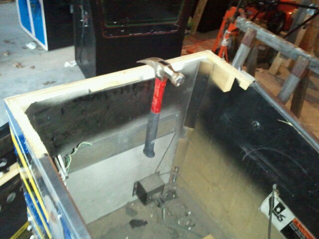 Work day 11 (1/30/11) - Added more corner brace wedges to the bottom of the cabinet and finally finished screwing the bottom togeather.